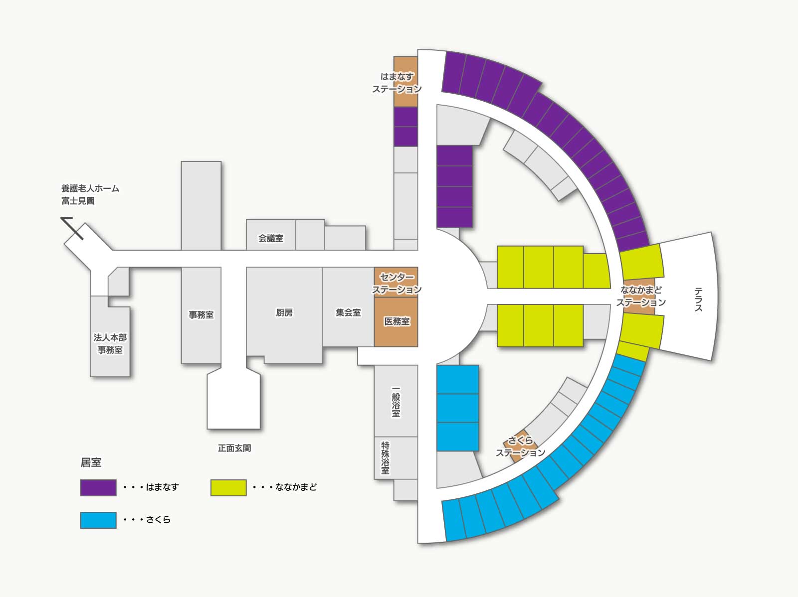 介護保険法に基づいて、要介護3〜5(短期入所は要支援1〜2、要介護1〜5)に認定された方を対象とした入所施設です。